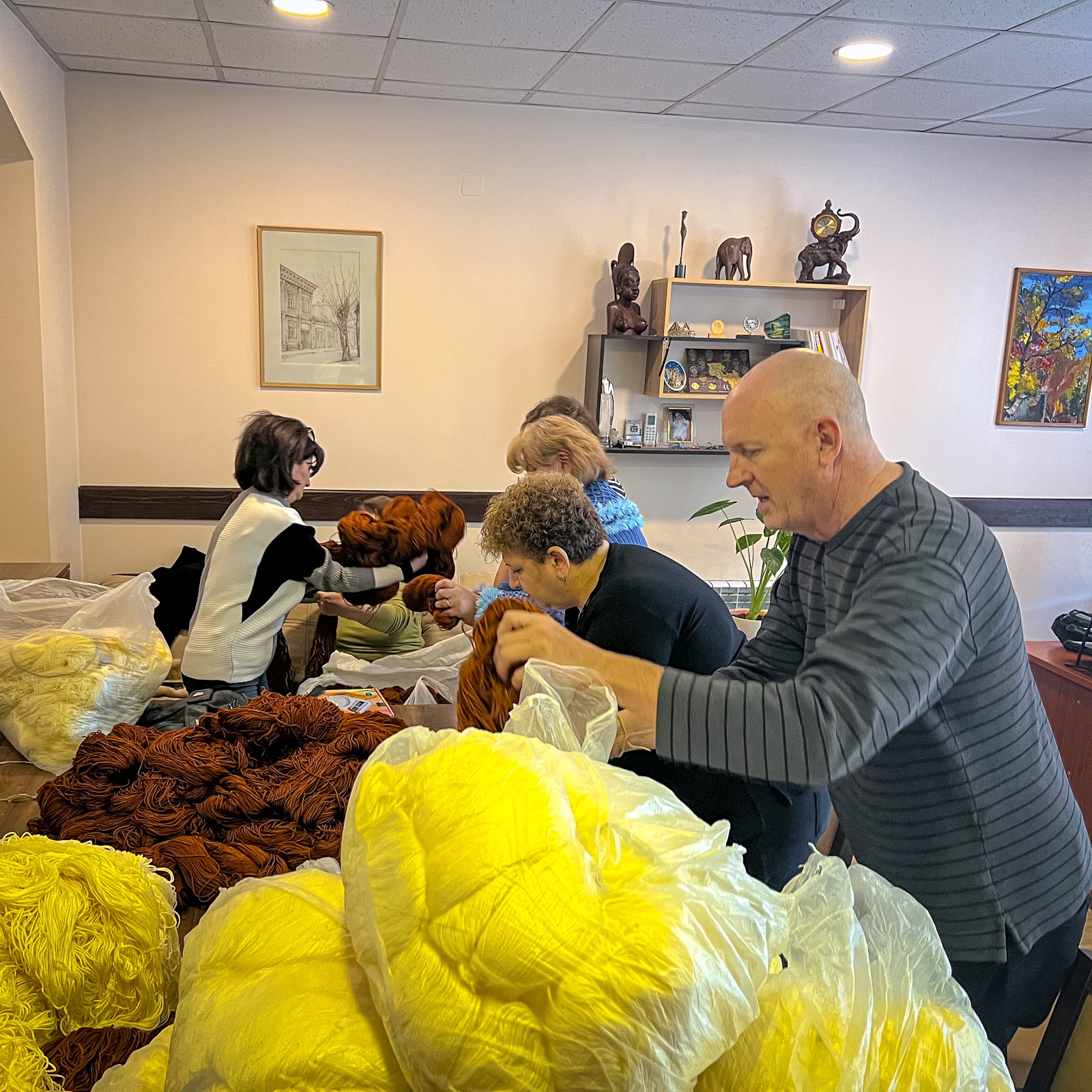 Kvinnene i Gyumri sorterer garnet som Tim Straight brakte med seg til Armenias nest største by.