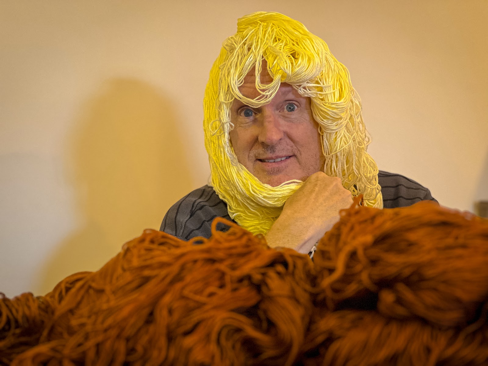 Tim Straight med favnen full av garn som kvinnene i Gyumri skal benytte til å produsere varme skjerf for flyktningene fra Nagorno-Karabakh.