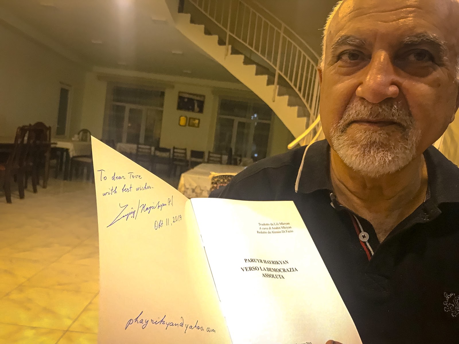 Vili med favnen full av bøker, gaver fra Paruyr Hayrikyan som har skrevet flere bøker både om politiske spørsmål og om sitt rikholdige liv. Han er også kjent for sine sanger og dikt.