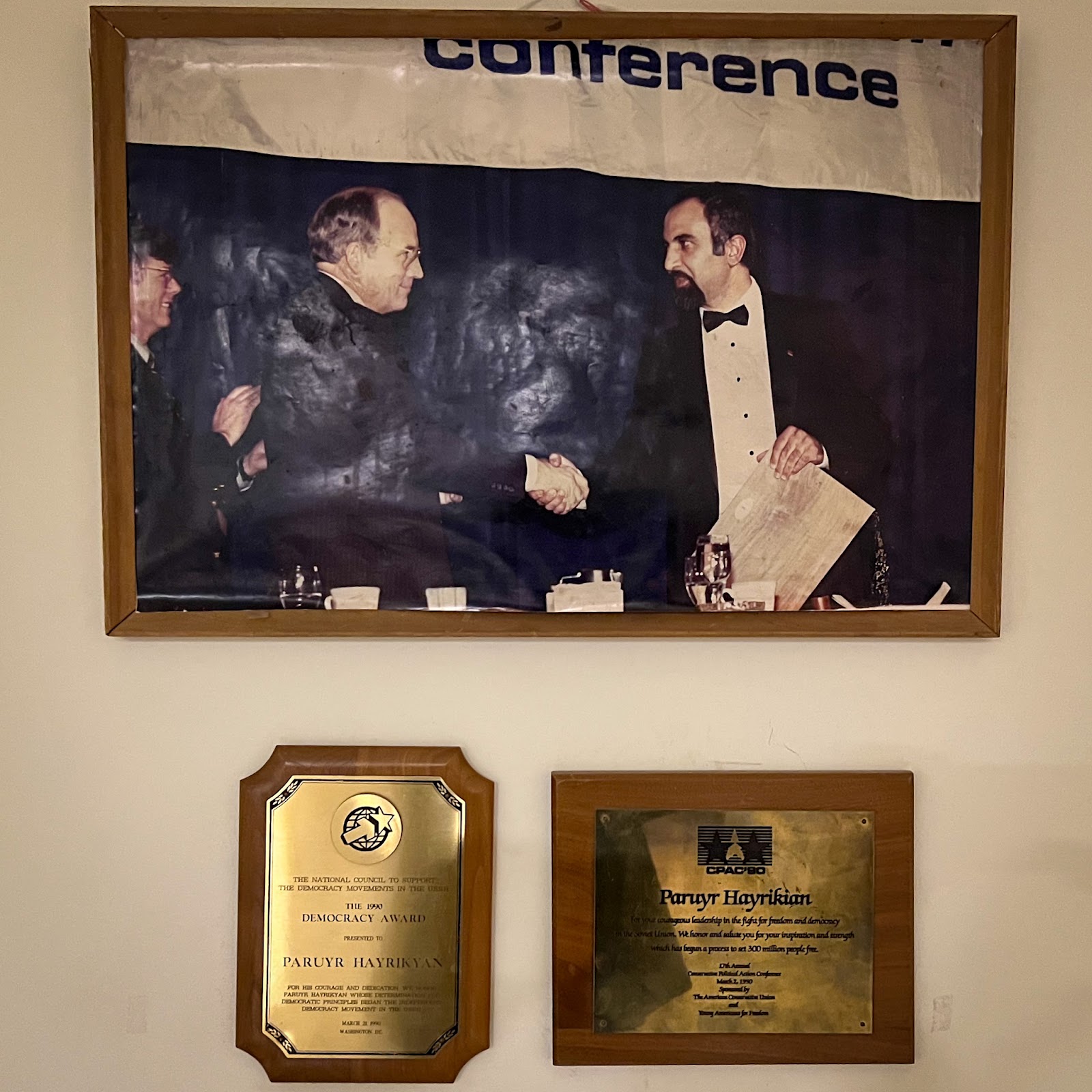 På veggene i Paruyrs hjem henger bilder og minner fra hans liv. Her mottar han en æresbevisning fra daværende forsvarsminister i USA, Dick Cheney.