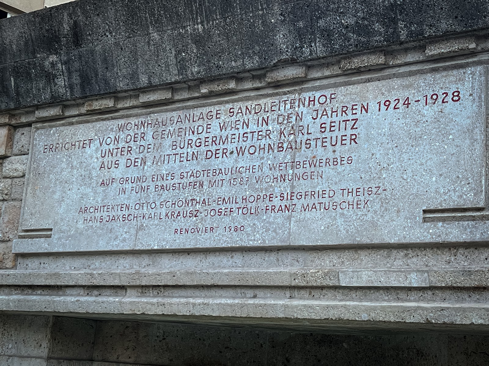 Minneplakett i boligkomplekset Sandleitenhof i Wien. Det ble satt i gang en storstilt offentlig boligbygging i det som ble kalt «Røde Wien» etter den første verdenskrig. Bare i dette boligkomplekset er det 1600 utleieleiligheter.