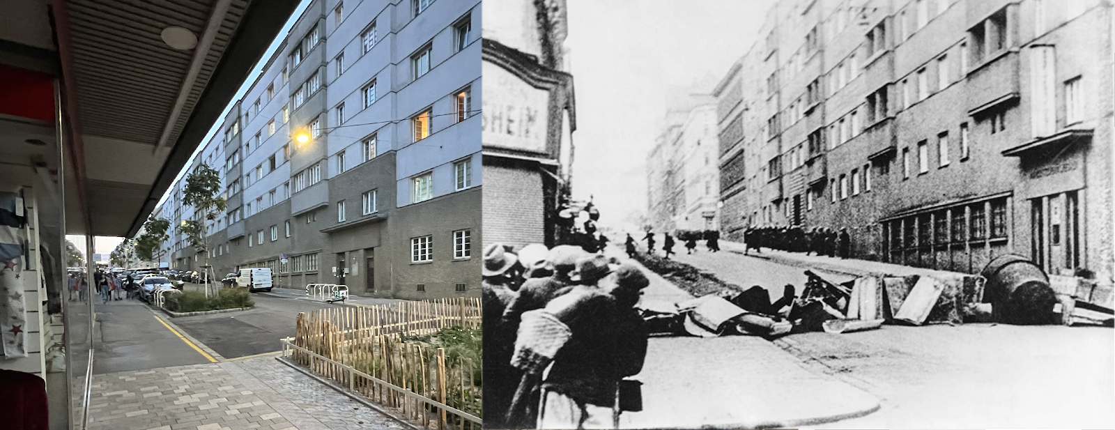 Wien 2023, samme gate i 1934. Fra gatekampene i bydelen Ottakring. I fire dager sloss sosialistene i «Schützbund» mot høyremilitsen og myndighetenes polit og hær. Foto: Roger Rein / Og fra boka Kurt Bauer: Der Februaraufstand 1934