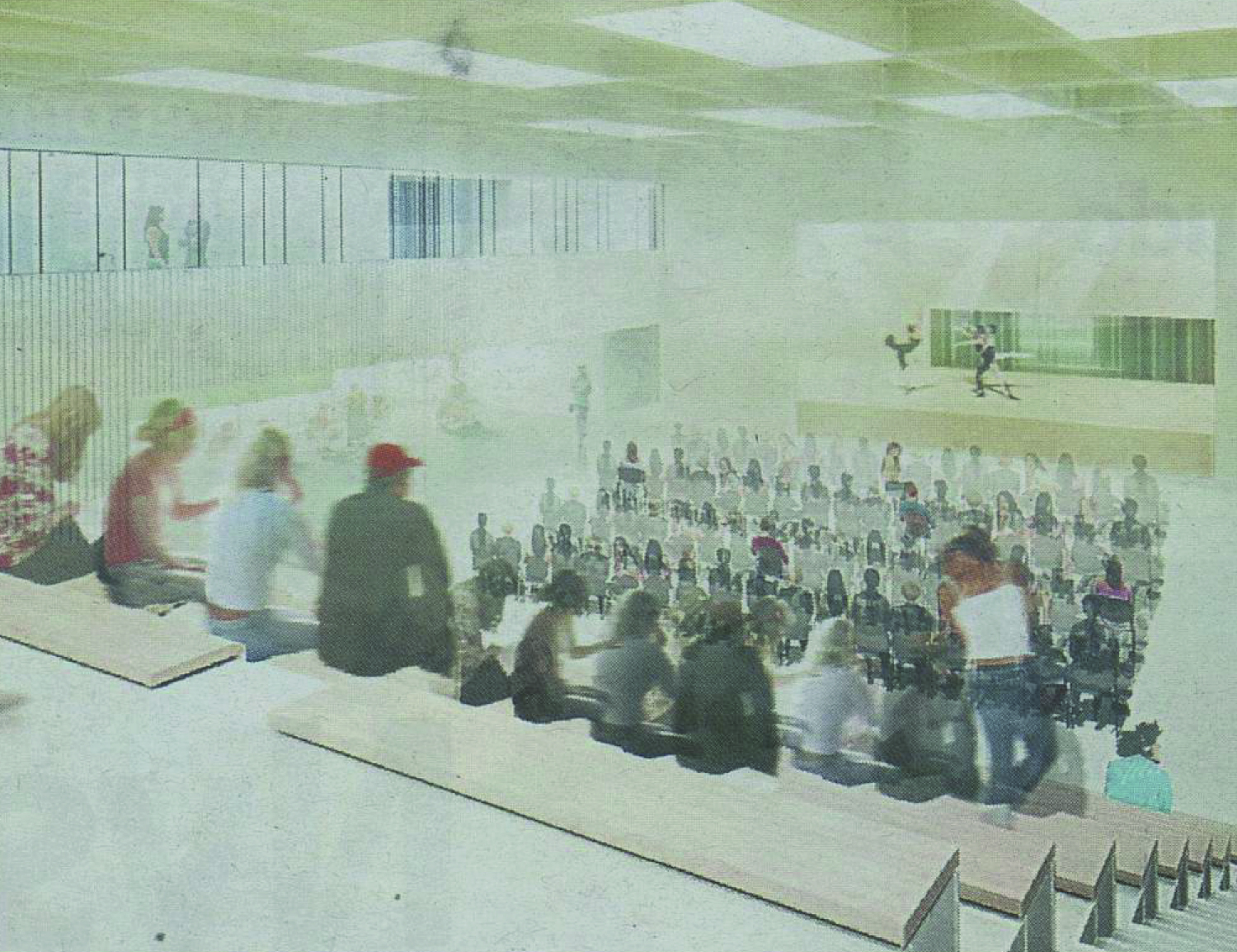 Kulturscenen på ungdomsskolen. Torpedert ble også rådmannens forslag om å bygge en skikkelig kulturscene i tilknytning til og samtidig med at det skulle bygges ny ungdomsskole på Røstad.