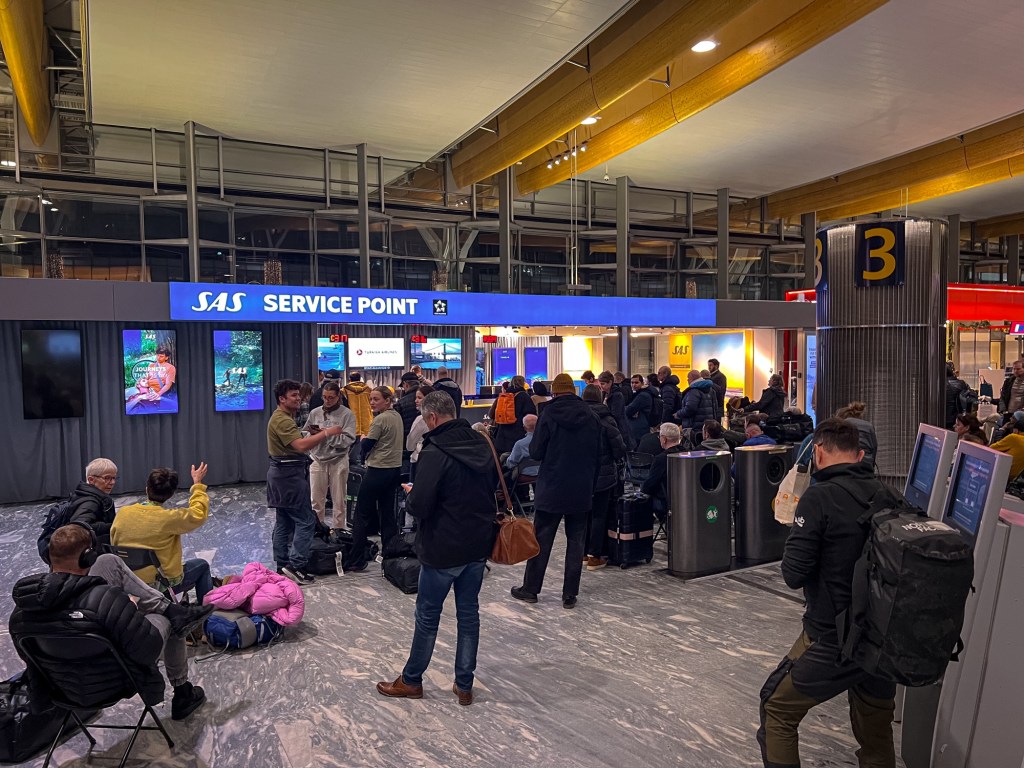 En ny runde på Gardermoen. Da havnet jeg i køen for «service»-senteret til SAS. Der sto det to hundre andre og ventet på tur. Jeg trakk min kølapp og satte meg ned for å vente. Der ble jeg sittende lenge. Først var de tre stykker bak skranken. Etter hvert ble det bare en igjen av dem. Og køen av dem som trengte hjelp bare vokste.