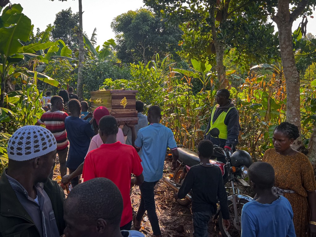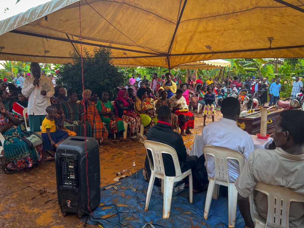 Det er mange tradisjoner i forbindelse med en begravelse i Uganda. Tradisjoner som vi ikke kjenner fra vårt eget land. Blant annet det vi var med på søndag, dagen før begravelsen. Kvinnen døde hjemme og liket ble lagt i huset slik at besøkende fikk tatt farvel og vist henne den siste ære. Da vi fikk høre om dødsfallet fant Hans, Sheila og jeg det riktig å besøke familien og kondolere.