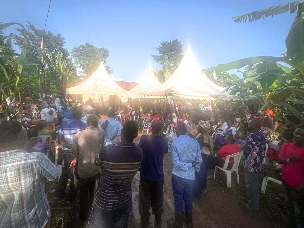 Den som ønsket det fikk en tallerken med en mos lagd av matbananer og en bit kjøtt. Et kor var på plass og bøe på vakker religiøs sang. Den unge kvinnen jeg sto ved siden av oversatte for meg fra luganda til engelsk, slik at jeg bedre kunne forstå hva alt handlet om.