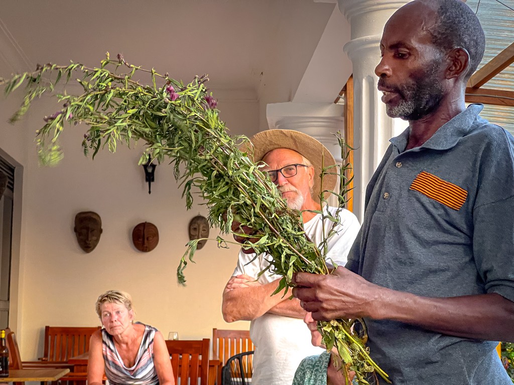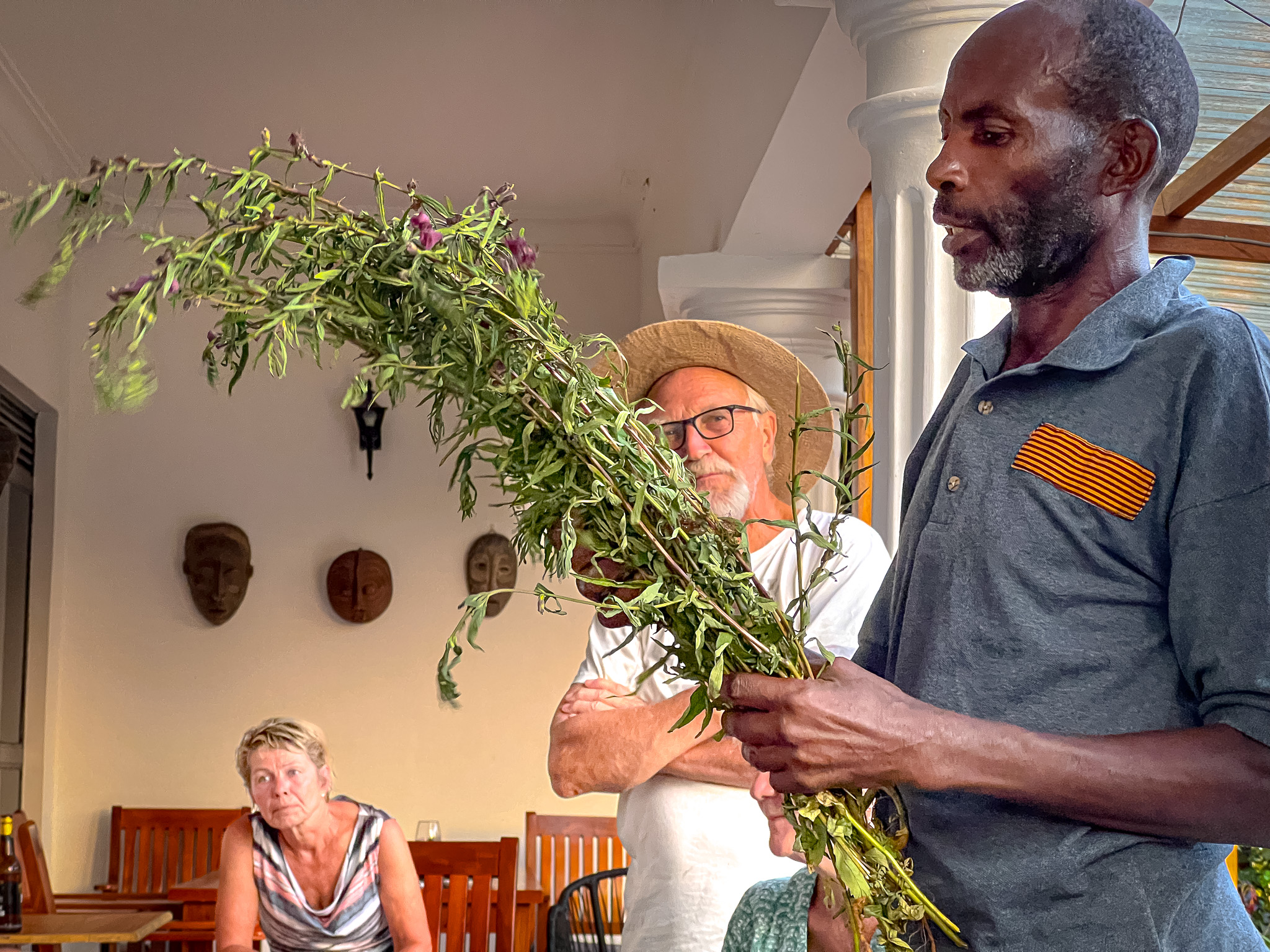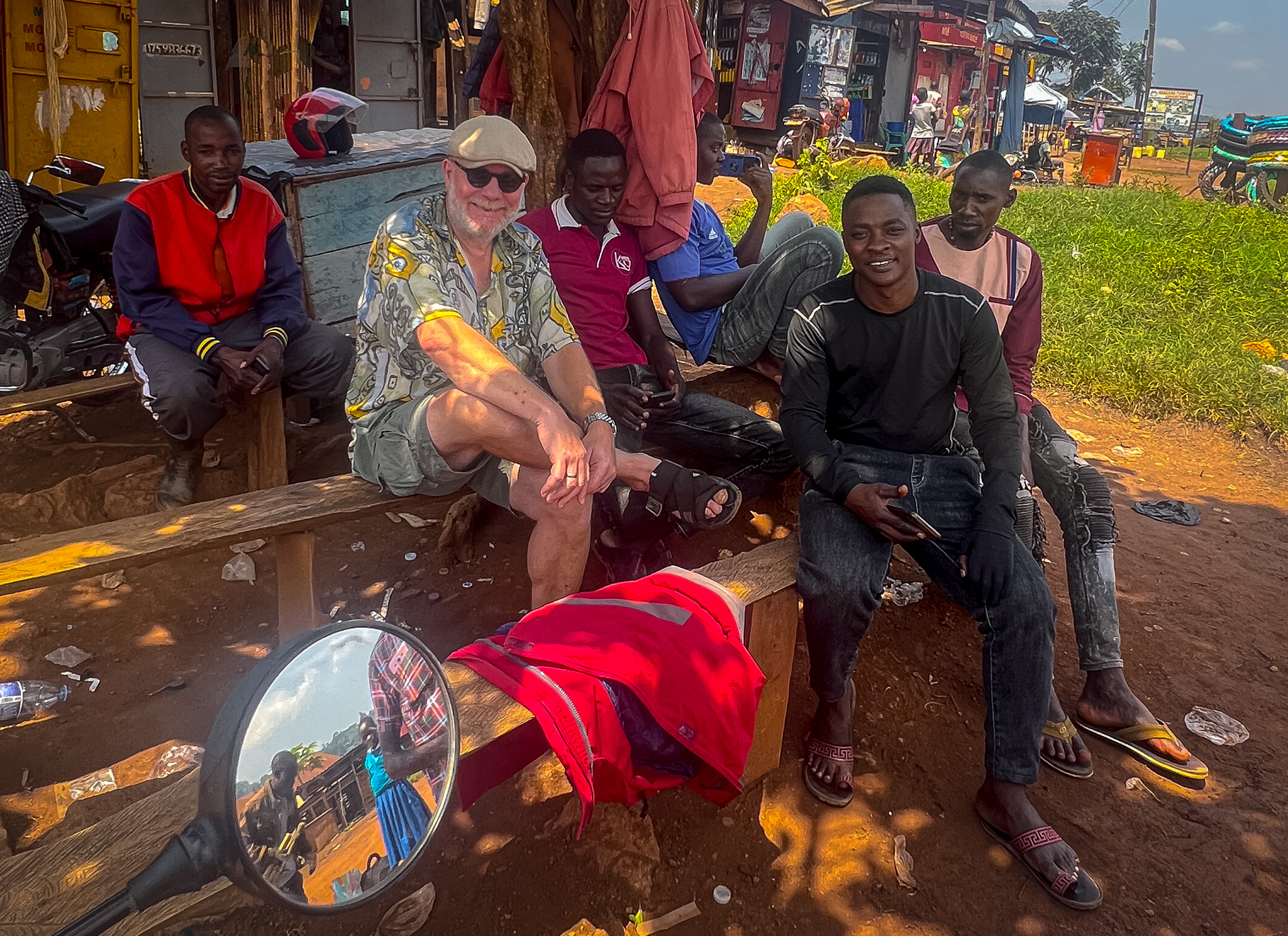 Les mer om Hans på denne lenkenI midten sitter Sheila. Det er Sheila som er den utadvendte driveren av Venna Haven Farm. Alle i landsbyen kjenner «madam Sheila», som de kaller henne. En bestemt dame med mange ideer i hodet, og med en gjennomføringsevne som er beundringsverdig når en kjenner alle forutsetningene for å få gjennomført ting i dette samfunnet. Phiona (til venstre) og Jean er gamle skolevenner av Sheila, og hennes beste lokale støttespillere når det kommer til det å utvikle turisme på farmen. Jeg fikk god kontakt og stor respekt for alle tre da jeg bodde på farmen i nesten seks uker. La meg fortsette med disse damene. Sheila og Jean (til venstre) er allerede nevnt. Også de tre andre er venner fra skoletida, de gikk sammen på internatskole i flere år i tenårene. Etterpå har de holdt sammen og møttes jevnlig. Videre følger Shakira (som er en av landets største kaffeprodusenter, har en stor farm og driver innen turisme lenger vest i Uganda), Judith (som jobber i en internasjonal organisasjon for barn og ungdom og har flere utenlandsopphold bak seg) og til slutt Ester (som er lege og sammen med sin mann driver et sykehus vest i Uganda).Denne mannen har jeg hatt mange gode samtaler med. Joseph Baseka er en ressurs i landsbyen. Han er pensjonist etter mange år som lærer her. Vi har sittet sammen i mange timer og pratet om smått og stort. Joseph er en mange i landsbyen støtter seg på. Han har liten bar som er et samlingssted gjennom dagene. Han er også sterkt engasjert i humanitært arbeid både gjennom den katolske menigheten og skolen han driver sammen med sin kone. Tidligere var han politiker i distriktet (fylket). Nå er det kona hans som er aktiv på den fronten. Hun er chairperson (ordfører) i landsbyen.Joseph fortalte meg tidlig at han var på jakt etter en sixpence, som den jeg har gått meg under hele oppholdet. Han fant imidlertid ingen hos de mange selgerne som enten farer langs landevegen eller på markedet i Kasanje. Under det siste besøket overrasket jeg Joseph med å gi ham capsen min som en gave. «Men du må love meg at du vasker den», sa jeg. Jeg synes sixpencen passet ham godt, minst like godt som hos meg. Jeg og Joseph holder kontakten via WhatsApp. Jeg ser fram til å møte ham igjen.Jacenta Baseka, kona til Joseph, er landsbyens ordfører, eller chairperson som de sier her. Henne har jeg møtt flere ganger, men det ble bare tid til korte prater for hun er en travel dame med mange oppgaver. En opplagt ressursperson i lokalmiljøet og en kvinne som det oser tillit av. Her mottar en glad Jacenta den norske gruppens gave til landsbyen. Det er Hallfrid Skimmeli som overrekker gaven.Josam er den eldste i arbeidsstokken på Venna Haven Farm. Han er opplagt en klok mann, for det er ham mange går til når de skal ha framført noen ærender i forhold til farmen. Så også i forhold til meg, et par ganger har han vært bindeledd mellom meg og folk som ville møte og snakke med meg. På bildet forteller Josam om medisinske planter som brukes i folkemedisinen i Uganda. Han på mange måter landsbyens medisindoktor da han stor kunnskap om hva som skal til for å kurere enkelte sykdommer og lidelser. Her sitter jeg sammen med boda-boda-gjengen i Kasanje. Boda-boda er motorsykkeldrosjen, den mest brukte kollektivtrafikken i nærområdet. Turen fra Kasanje ned til farmen koster fra 3000 til 7000 shilling (9 – 21 kroner), alt etter hvor god jeg er til å forhandle prisen. Dette er hovedinntektskilden for disse. Eier de motorsykkelen selv kan de gjøre 100.000 shilling brutto på en god dag, men det er før utgifter til motorsykkel og drivstoff. Kjører de for en annen eier av motorsykkelen er dagslønna 20.000 shilling (60 kroner). Jeg tror de fleste er leiesjåfører.