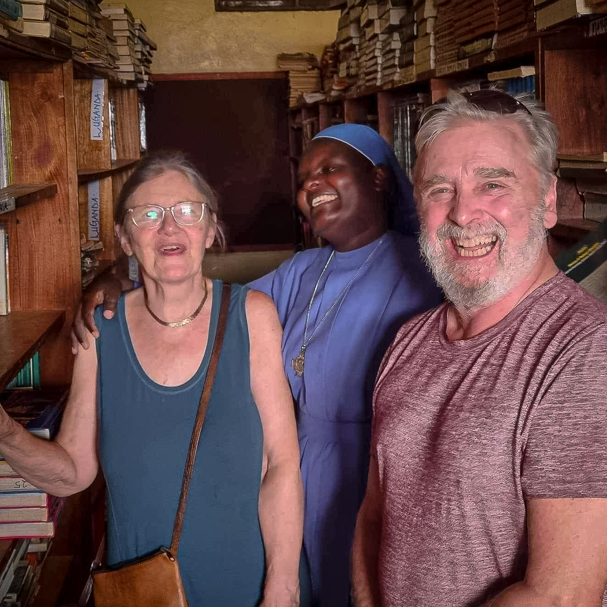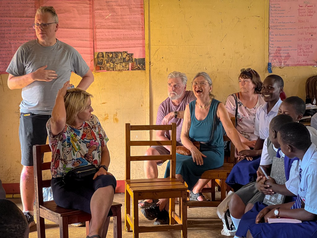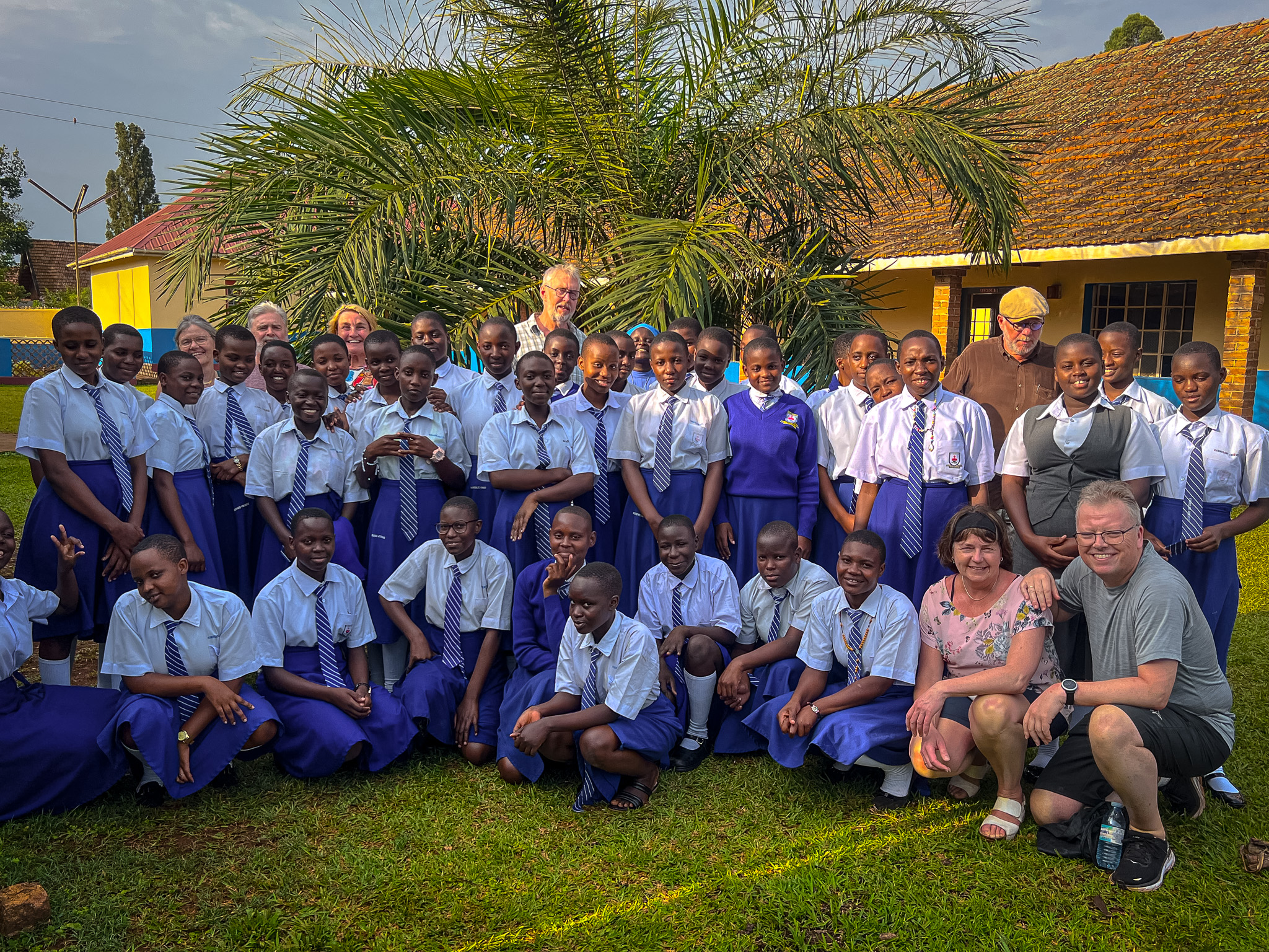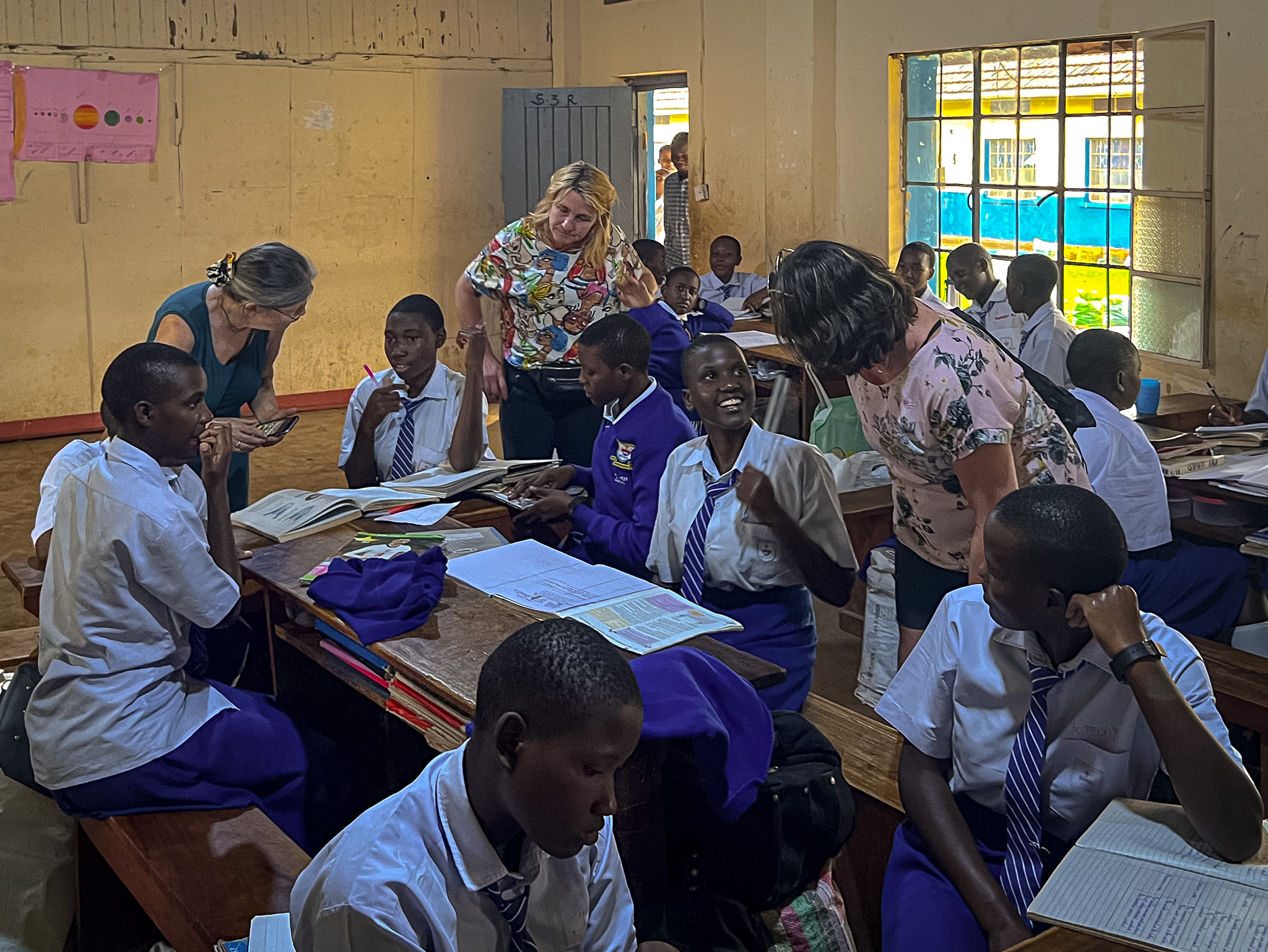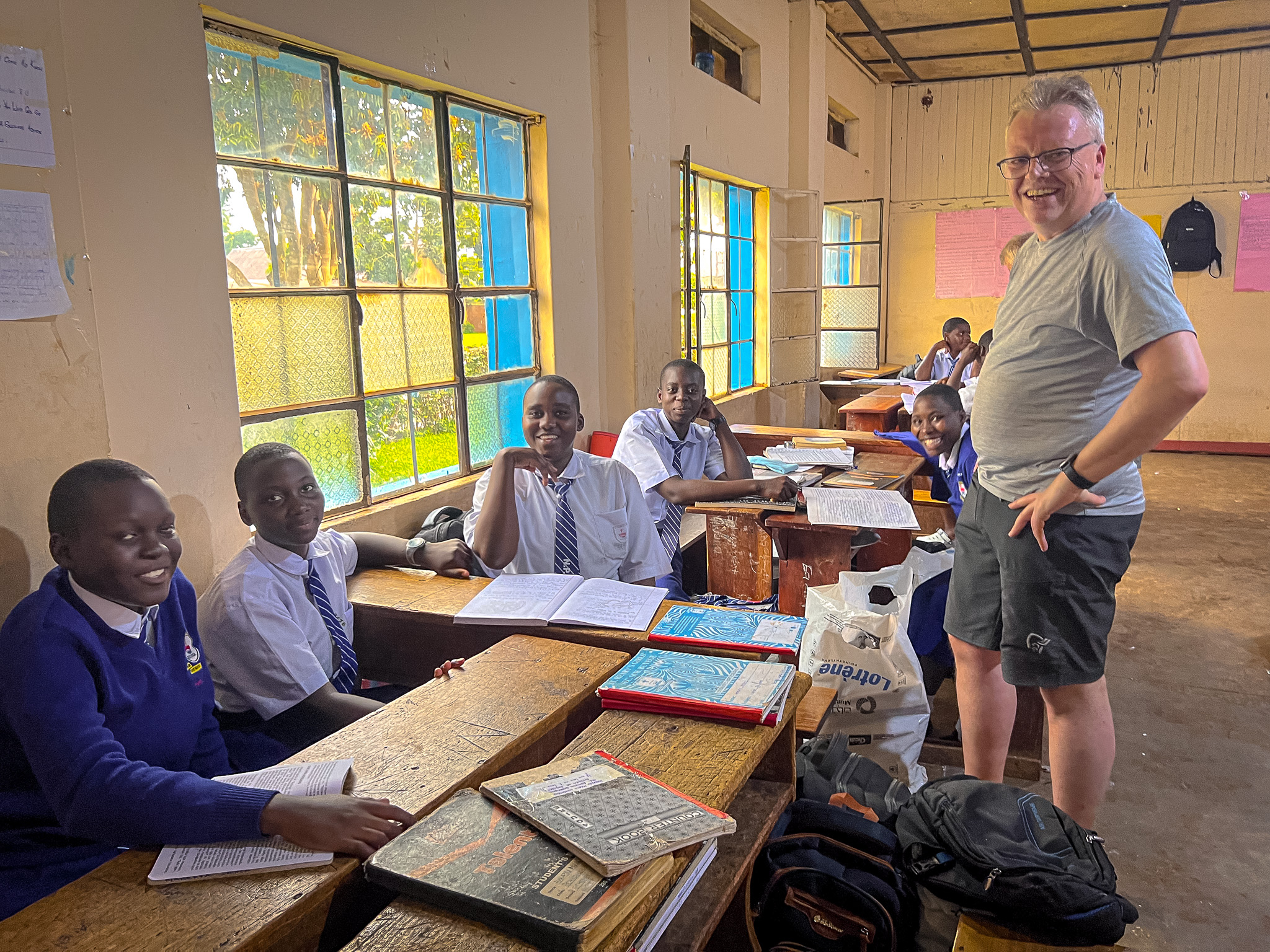 Terje i samtale med jentene i senior 3, en av de klassene vi var innom da vi besøkte St. Henrys.Her sitter jentene i Senior 2 og jobber på egen hånd. For mange var det biologi det handlet om.Det kom mange forskjellige spørsmål og ble gitt mange forskjellige svar, også dem som utløste latter i forsamlingen.Vi fikk mange og ulike spørsmål fra vitebegjærlige 14-15-åringer i klassen på St. Henrys. De var opptatt av alt fra norske samfunnsforhold til kjæresteri og mulighetene for å studere i Norge, for å nevne noe.En av jentene ble veldig nysgjerrig på håret til Hallfrid. Hun tok av hårbåndet og begynte med en enkel frisering.Et gruppebilde måtte til. Foto: Historielærer TimothyHallfrid er jo bibliotekar, og da hun hørte om skolens bibliotek ble det selvsagt tid for en befaring. Som dere ser var det et hyggelig klima mellom Christina og de norske gjestene Hallfrid og Lars Erik. Foto: Terje LundSkolen er nesten selvforsynt med egen mat. De har mange ulike dyr, både kyr, geiter, høner og gris. Og de har arealer hvor de dyrker ulike grønnsaker og frukt. Jentene ved skolen deltar selv i arbeidet med jordbruksproduksjonen.Fra et skolebesøk til en primary school i Kasanje. Den ble startet av og drives også i dag av Joseph og Jacenta Baseka, to ressurspersoner i Buyege. Hun er ordfører, mannen leder den katolske hjelpeorganisasjonen og driver en bar i landsbyen.Joseph forteller om bakgrunnen for skolen.Hege forteller elevene om Norge, men også om andre ting.Skolen er opptatt av miljøvern og forsøpling, og har fått laget slike søppelstativ som de selger til inntekt for driften av skolen.Terje og Heidi viser video av norsk vinter. Det forundret ungene på skolen.Hege, Terje og Heidi vakte interesse blant elevene da de fortalte om Norge.Vi fikk smake på jackfruit. En av elevene klatret høyt opp i og rundt i treet for å finne en moden frukt.Tidligere under besøket i Buyege var jeg invitert til en time med den eldste klassen ved St. Henrys. Her et bilde fra det besøket.