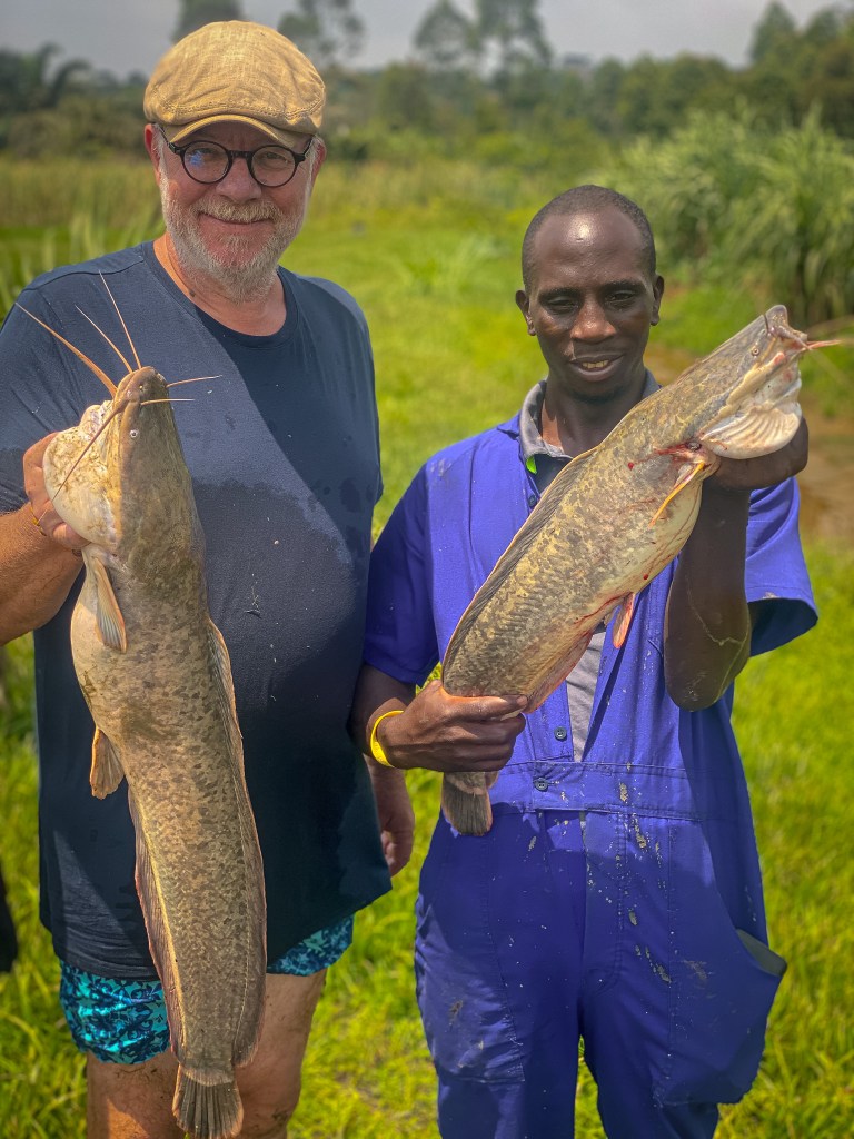 - Sammen med Inocent viser jeg fram to av de største catfishene (mallene) som vi tok opp fra dammen.