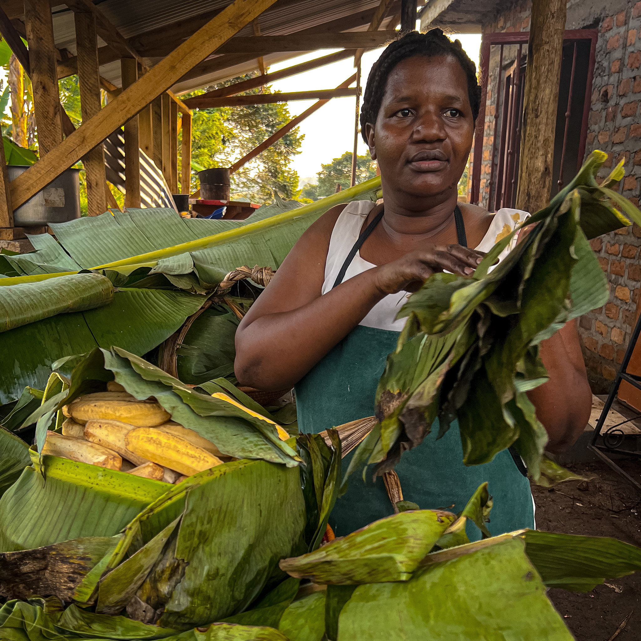 - Anett ordner klar matoken før langtidskoking. Matoke er matbananen som er en sånn viktig del av det ugandiske kostholdet.