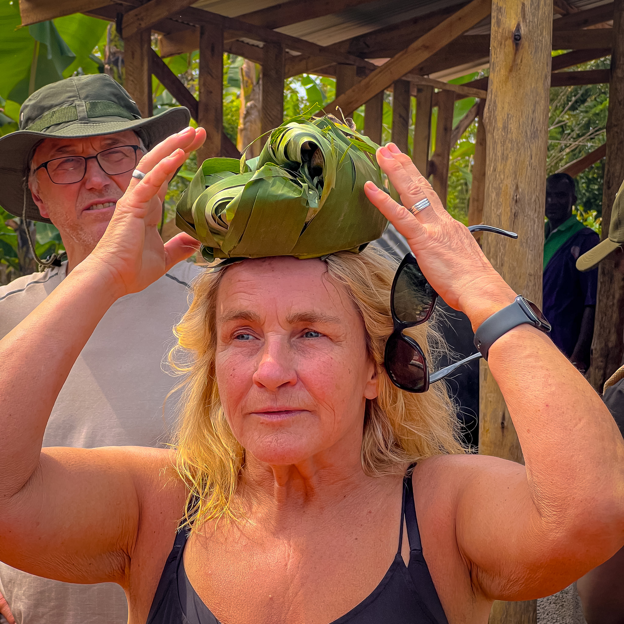 - Phiona instruerer gjestene i hvordan ting skal bæres på hodet.