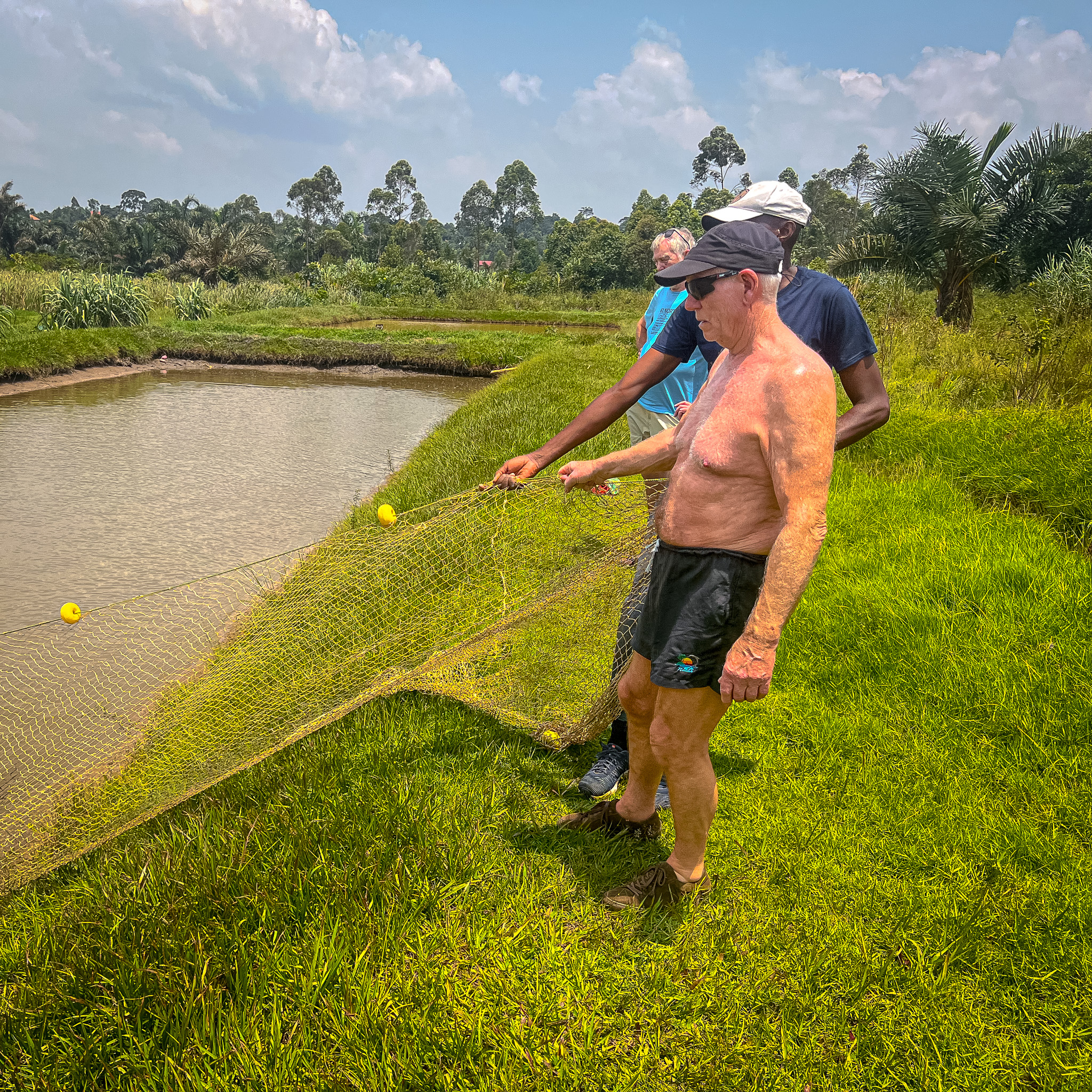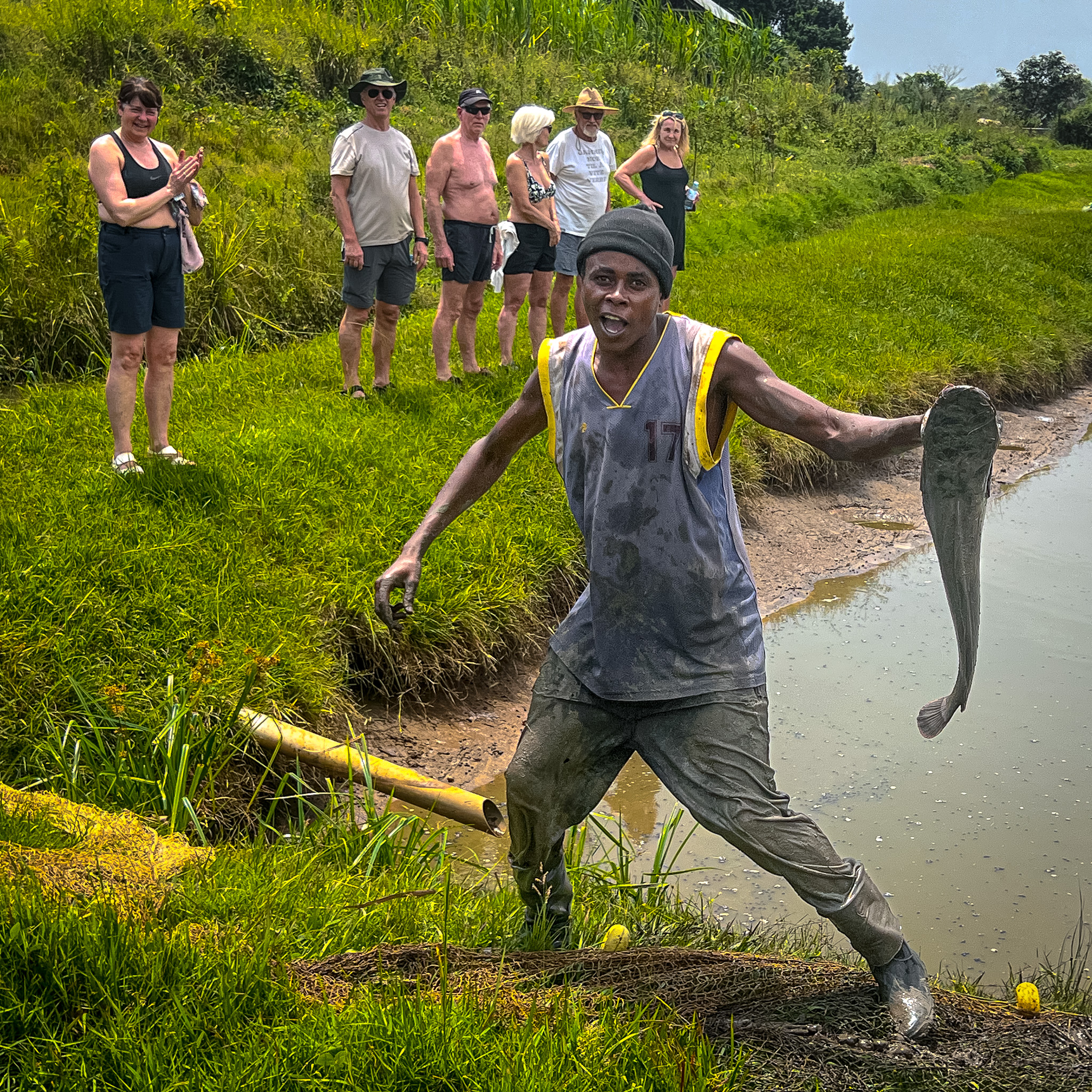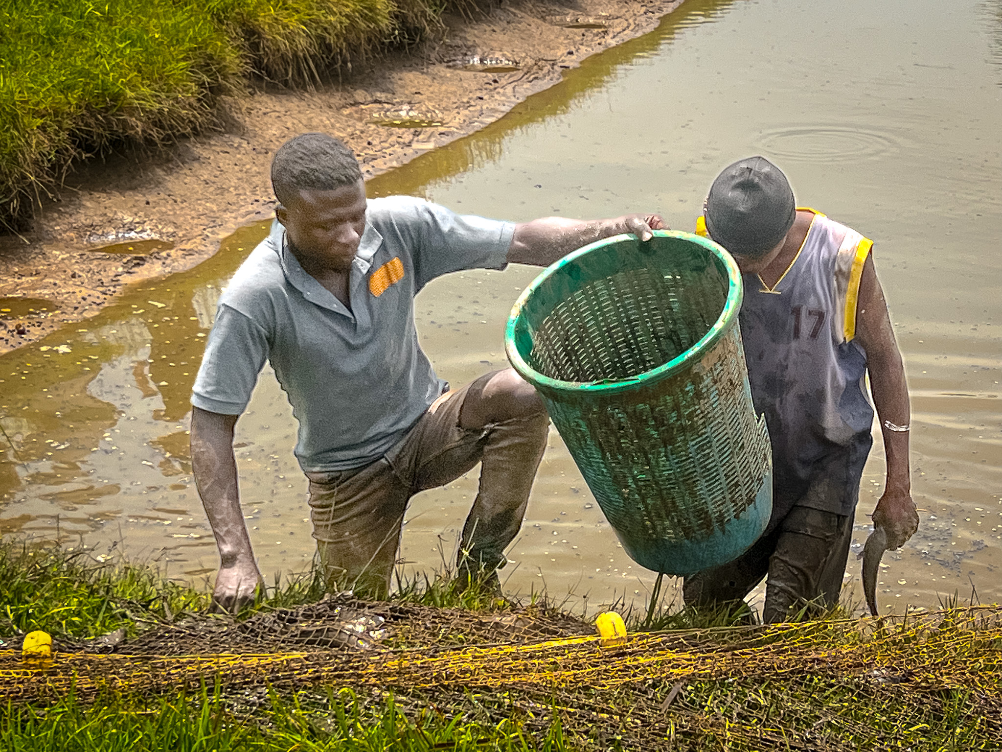 - Eric viser fra en catfish, som sammen med tilapia er fiskene som oppdretts i fiskedammene på Venna.
