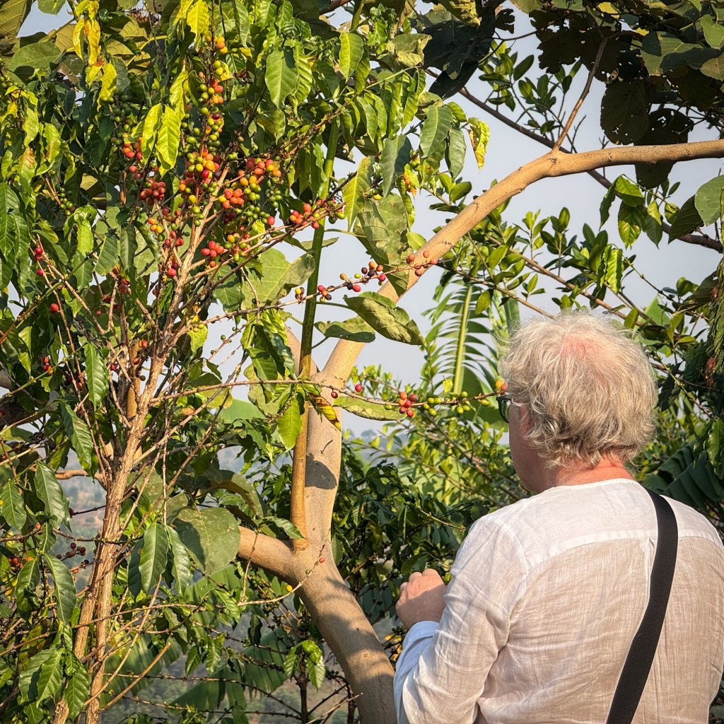 Men det som gjør stedet unikt, er ikke bare volum eller kvalitet – det er måten det hele er bygget opp på. Kaffebuskene er ikke plantet i rette rekker som vinranker, slik jeg hadde sett for meg. De vokser i samspill med omgivelsene, skjermet for sola av bananplanter, og omgitt av vekster som har både næringsmessig og medisinsk verdi. Alt har en plass og en funksjon.