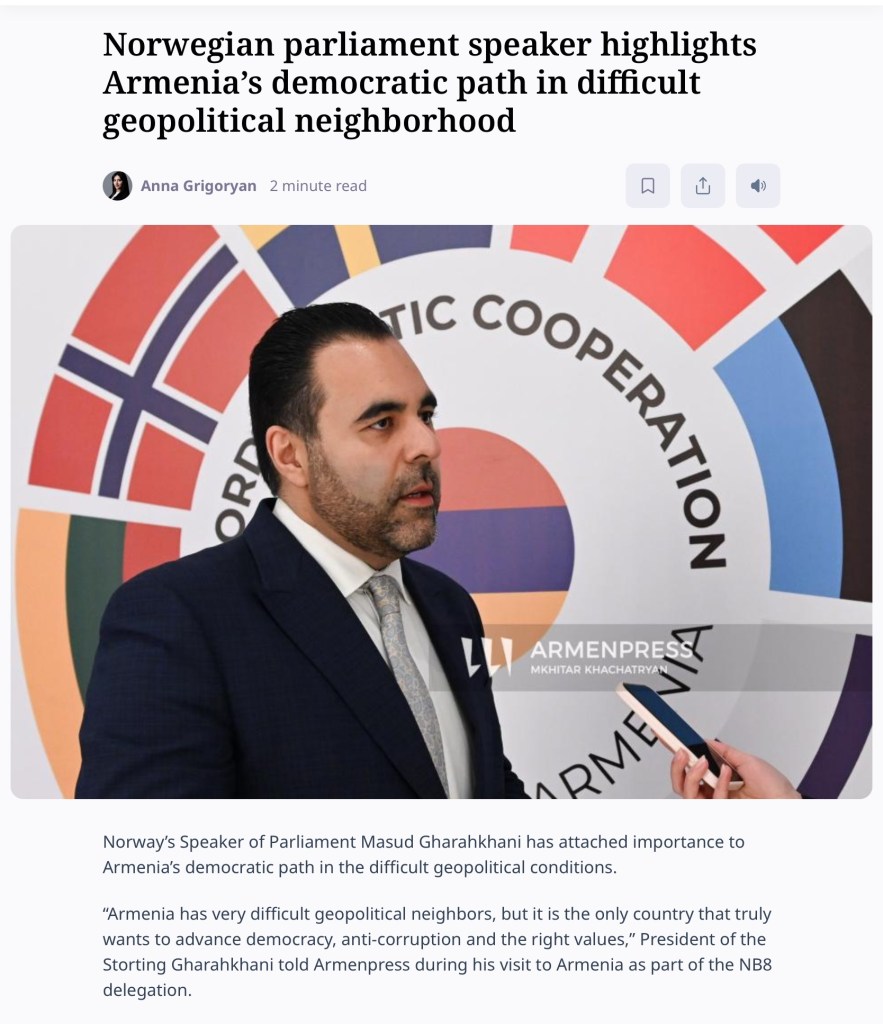Masud fortalte også om sitt eget besøk til Jerevan nylig. Som stortingspresident var han del av en delegasjon fra de nordiske og baltiske landene, som var i Armenia for å styrke samarbeidet med landet – med særlig vekt på demokratiutvikling, fredsprosesser og europeisk integrasjon.