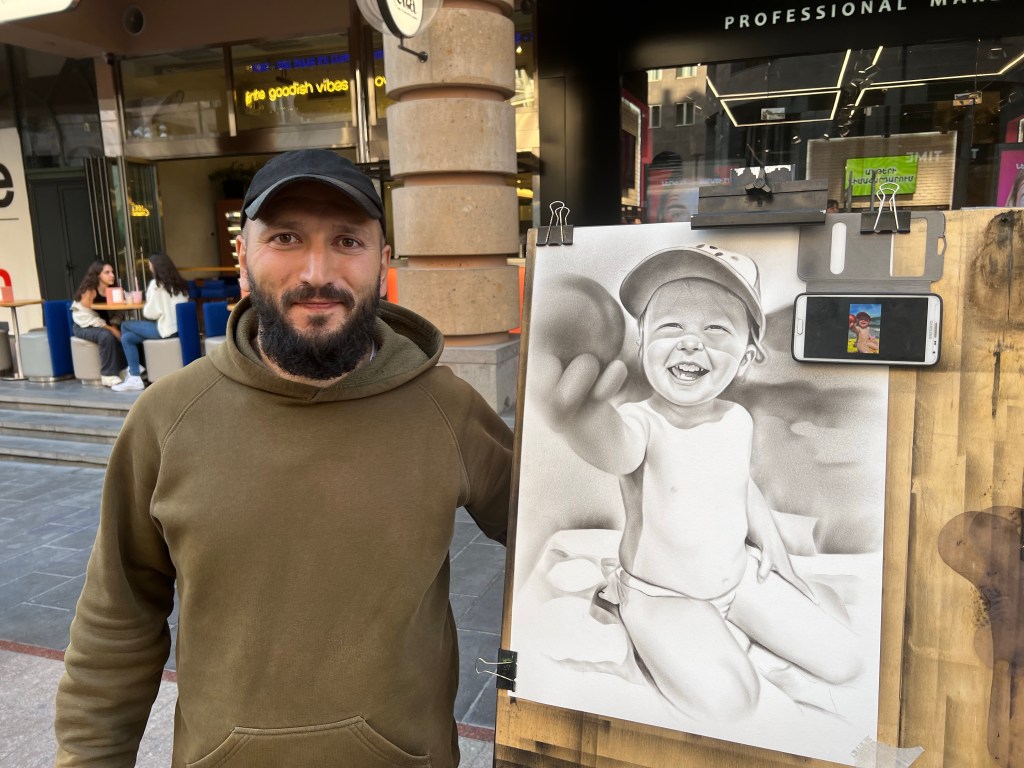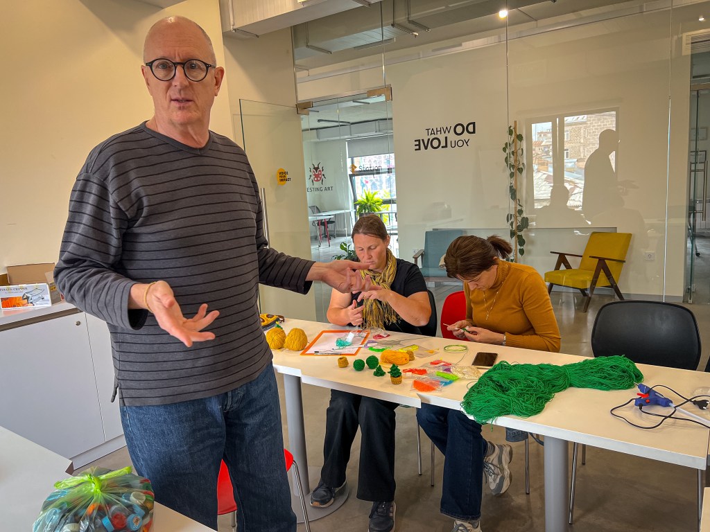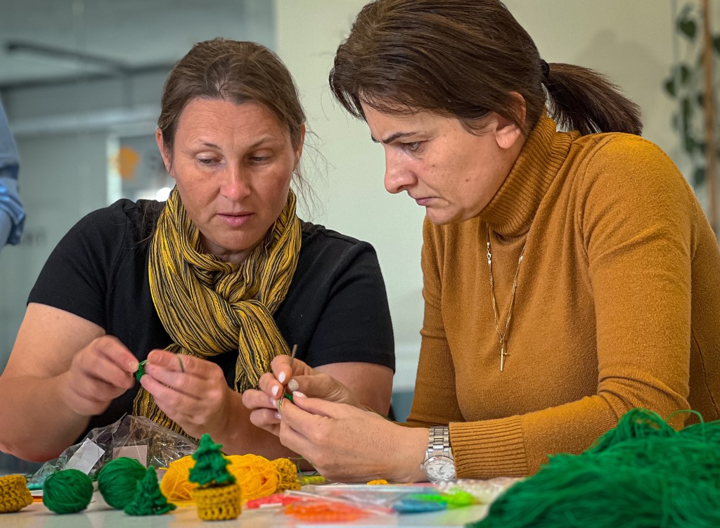 Kvinner i Gyumri hjelper Tim Straigt med å strikke skjerf til flyktningene fra Nagorno-Karabakh.